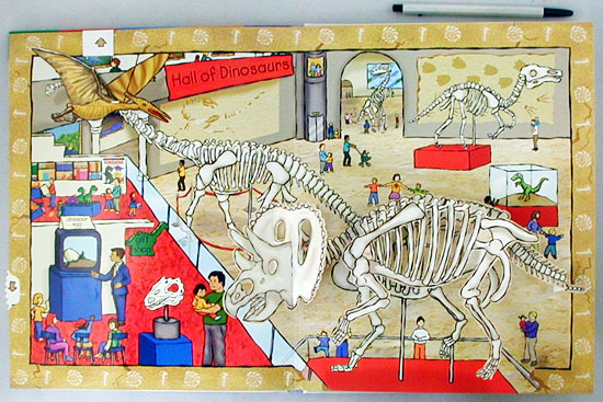 This book is a treasure chest of special effects. There are large dinosaurs that pop up in the center of pages; pull-tabs that cause unexpected results; push-pull tabs that move dinosaurs across pages and up and down; textured and glittering papers that fill cut-out spaces on the pages; and an absolutely delightful purple baby dinosaur that can be pulled up from its egg. Special effects alone; however, are not the only strength of this book. There is a double page spread that simulates a trip to a natural history museum with huge pop-up dinosaur skeletons and a typical moving screen presentation so familiar to museum visitors in large cities. Various dinosaur types are illustrated and identified with their names also spelled out phonically for pronunciation so the reader will be informed as well as entertained and amused.