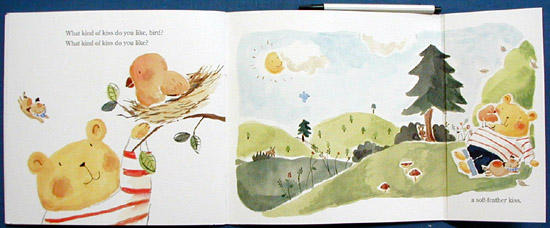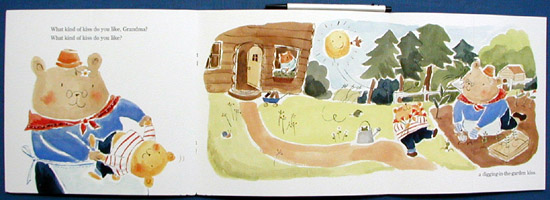 This adorable book illustrates what a cub's parents, grandma, puppy, and bird need during the day-special kisses from him. First the little bear asks his Mama, "What kind of kiss do you like-?" She answers him in a page that folds out twice, "A good-morning kiss, a rise-and-shine kiss, a kiss-to-start-the-day kiss." The same happens with each character he asks throughout the story; then, at the close of day, the little bear describes his favorite kisses, including "a sweet-dreams, sleep-tight, till-tomorrow kiss." The simple watercolor illustrations of the bear's cozy surroundings and his loving family reinforce the text of this excellent read-aloud.