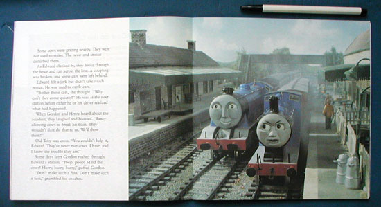 In the title story, Gordon and Henry laugh at Edward when some cows break his train. But when a cow blocks the line several days later, it's Edward who has the last laugh. Also included are "Double Trouble," "Old Iron," and "Percy Takes the Plunge."