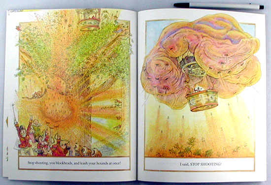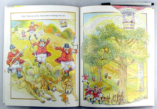 A little girl comes home from school after learning about birds and mammals. She has two pets: a dog named Pinkerton and a cat named Rose. For homework, the little girl is supposed to identify ten different birds and mammals. The girl and her mother take Pinkerton and Rose into the woods to find these animals. A group of hunters are also going into the woods on this day. They travel into the woods in a hot air balloon to learn from their teacher, Dr. Kibble, how to hunt foxes. The hunters create lots of excitement for the little girl, her mother, and her pets, which almost causes her not to finish her schoolwork. The family decides to take a break for their picnic, and a wonderful surprise awaits them. Steven Kellogg brings the story to life with his wonderful text and his brilliant illustrations. The pictures are very elaborate. Through his extensive work in color, he makes the illustrations seem almost real. The pictures also tend to be very busy and full of action, which is intensified through Kellogg's use of color. 2002 (orig. 1982), Dial Books for Young Readers, Ages 4 to 8. - Jennifer Tinsley