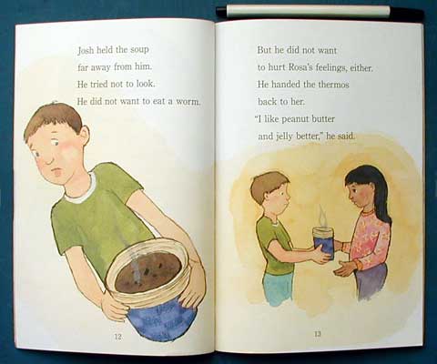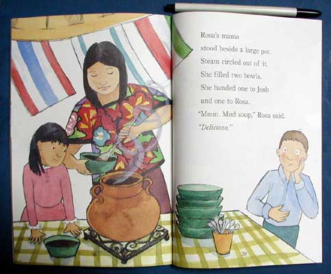 Josh notices that Rosa always brings "mud soup" to school and he is grossed out. He doesn't want to hurt Rosa's feelings when she offers him a taste, and diffuses the offers each time. When he sees Rosa's mama and abuela digging in the garden by a pail of mud, he is sure that this soup needs to be avoided. But at the school's International Day, parents (two fathers, here) bring food and Rosa's mama brings the infamous mud soup. It turns out to be black bean (recipe provided) and Josh tastes it: Delicioso! Four to ten short lines of text per page challenge the fully launched reader, and Josh's reaction, " His stomach jumped. His heart thumped" repeats. The overt moral of giving new things a try is also supported by Josh's tact in finding several ways to refuse. A short 3-word glossary of Spanish introduces the concept of a glossary, and the recipe is easy to follow. Guevara's watercolors feature the necessary action with pleasant gentle humor. A good choice to introduce the discussion of trying something new, and a nice introduction if your school has an International Food Festival.