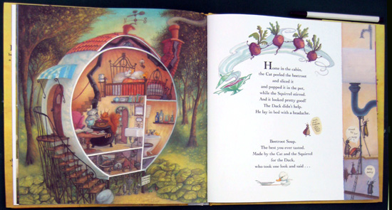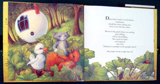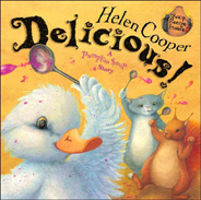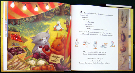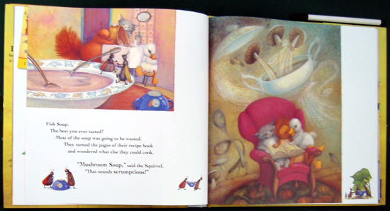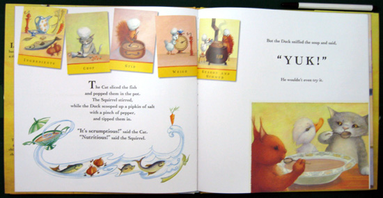 This is a cleverly-written story about the finicky Duck who will not eat any of the recipes Squirrel and Cat concoct for him unless it is his favorite, pumpkin soup. Absolutely nothing else will do. However, no matter how or where they all search for a pumpkin, none can be found. Cat even digs out an old recipe book to search for something else they can make. The three go fishing and cook up a batch of fish soup. "Scrumptious!" says the cat. "Nutritious!" says the squirrel. "YUCK!" Duck fusses. They go shopping and Duck does nothing but complain and whine to go home. Squirrel and Cat buy something quick before leaving for home: Beets. The best soup ever, thought Squirrel and Cat. Duck took one look at the pink soup and refused it. Then, he complained some more and went to bed with a headache. This is a really good book to read to the fussy child who refuses to eat certain foods. The insects along the periphery of each illustration distract from the main story but show a charming story in themselves and don't stand out enough to detract from the text. The ending is wonderfully different.