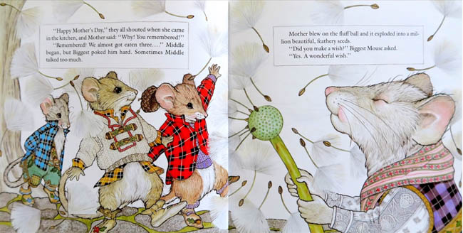 A story for Mother's Day, for spring, for any day. Three mouse brothers, clad in bright plaid shirts and lederhosen, leave their snug cottage, intent upon finding the perfect gifts for their mother. Their early morning search is filled with dangers: a snake hidden in the thick underbush, a fox running by. However, the mice are brave, and hand-in-tail, they traipse through brush and briars to find their presents. In the end, it is Little Mouse, returning empty-handed, who has the best surprise of all: a song. The perspective is from a mouse's vantage point: toadstools and ferns seem like trees; a ripe, juicy strawberry is so big that Middle Mouse can barely carry his gift in his two arms; a dandelion fluff ball towers over Biggest Mouse. Through deft, simple lines, Brett captures the brothers' fear, their enjoyment of the sights, smells and sounds of their world and finally, their sheer delight at finding just the right gifts for their appreciative mother. The finely honed details, the soft colors, the expressions of love and sharing make this a story that is as fresh and harmonious as Little Mouse's song.