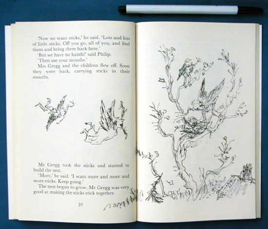 Told in the first person by the unnamed female protagonist, this short tale introduces us to the Greggs, who love to hunt. That is, until our heroine uses her magic finger on them and they learn from a duck's perspective what it means to be hunted. Simple, gray-tone drawings in this new edition advance the fantasy. - Dr. Judy Rowen